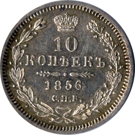 Лицевая сторона — новый гербовый орел с поднятыми крыльями, оборотная —обозначение номинала (10 копеекъ), окруженное венком из лавровой и дубовой ветвей и дата. Проба — 868, нормативный вес — 2,07 грамма.