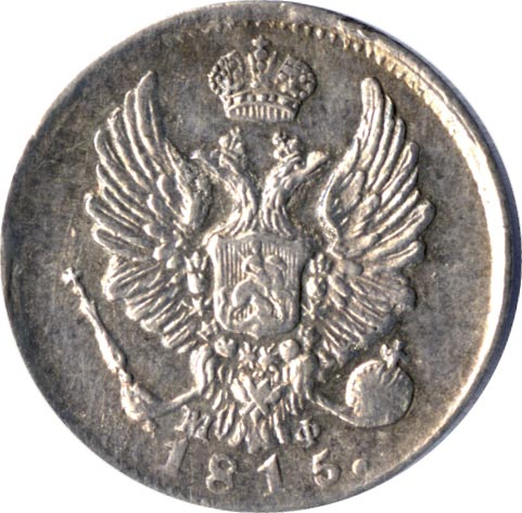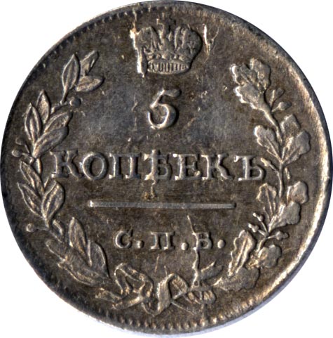 Лицевая сторона - двуглавый орел и дата, оборотная — обозначение номинала (5 копеекъ) в венке из лавровой и дубовой ветвей. Проба до 1813 года — 750, нормативный вес — 1,2 грамма; после 1813 года — проба 868, нормативный вес — 1,04 грамма.