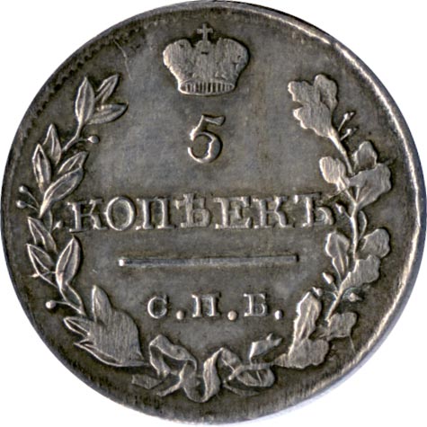 Лицевая сторона - двуглавый орел и дата, оборотная — обозначение номинала (5 копеекъ) в венке из лавровой и дубовой ветвей. Проба до 1813 года — 750, нормативный вес — 1,2 грамма; после 1813 года — проба 868, нормативный вес — 1,04 грамма.