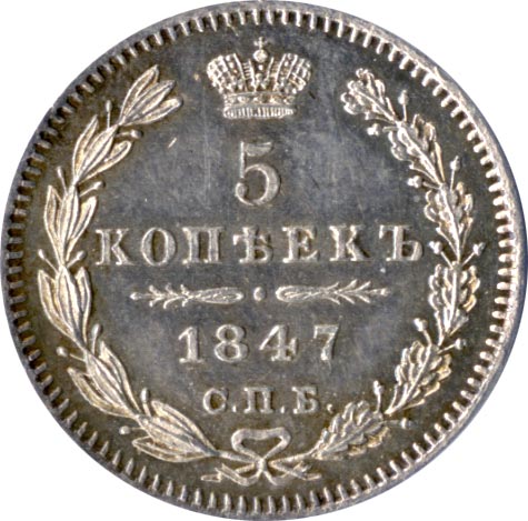 Лицевая сторона — новый гербовый орел с поднятыми крыльями, оборотная —обозначение номинала (5 копеекъ), окруженное венком из лавровой и дубовой ветвей и дата. Проба — 868, нормативный вес — 1,04 грамма.