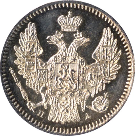 В январе 1830 года Николай I дает министру финансов Е. Ф. Канкрину устное указание «о сделании на золотых и серебряных монетах орла как на платиновых». На новом гербе крылья орла подняты, на них размещены шесть местных гербов — казанский, астраханский, сибирский, польский, херсонесский и финляндский. На груди орла — московский герб, на головах — короны. Выделяют четыре типа орла.