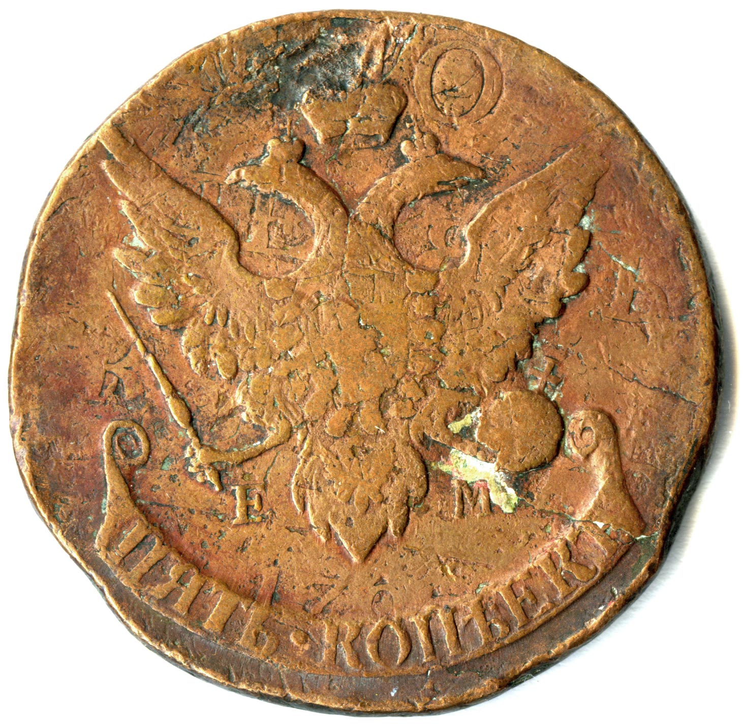 Лицевая сторона — двуглавый орел (выделяют 17 типов орла) и обозначение номинала (пять копеекъ), оборотная — вензель Екатерины II и дата. Нормативный вес — 51,19 грамма, гурт — сетка или шнур.