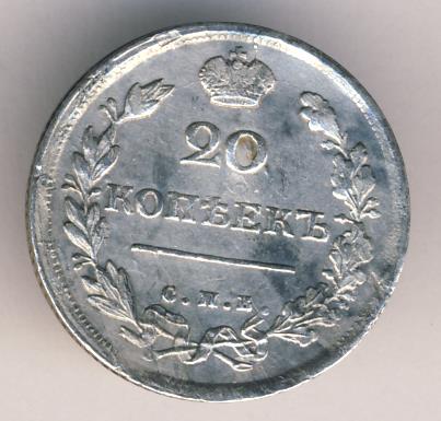 Лицевая сторона - двуглавый орел и дата, оборотная — обозначение номинала (20 копеекъ) в венке из лавровой и дубовой ветвей. Проба до 1813 года — 750, нормативный вес — 4,80 грамма; после 1813 года — проба 868, нормативный вес — 4,15 грамма.