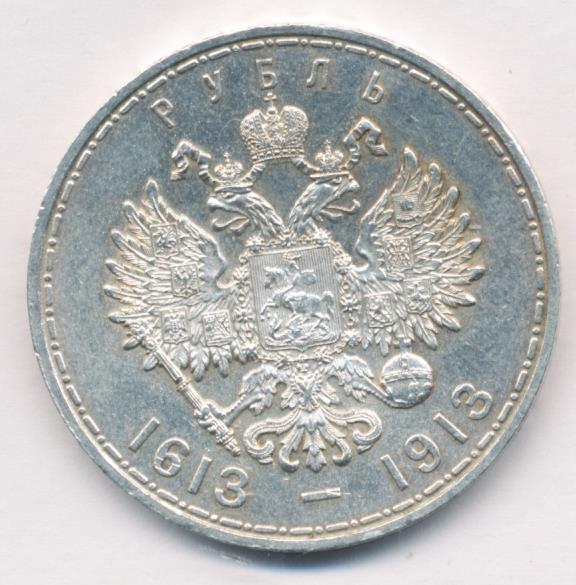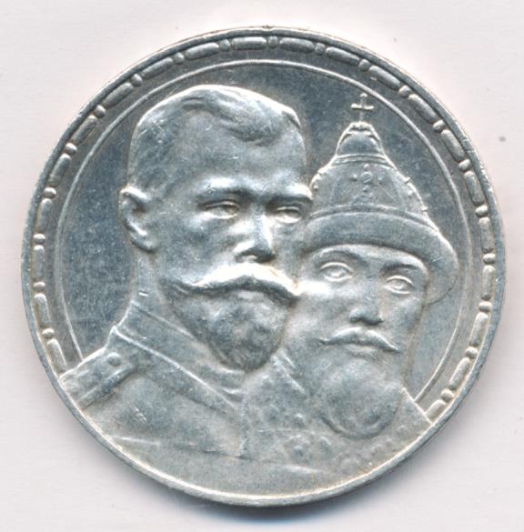 К 300-летию царствования Дома Романовых выпустили и юбилейный рубль, отчеканенный грандиозным тиражом почти в полтора миллиона экземпляров. На лицевой стороне монеты разместили портрет императора Николая II в военной форме, за спиной которого виден основатель династии, царь Михаил Романов в царском одеянии и в шапке Мономаха.