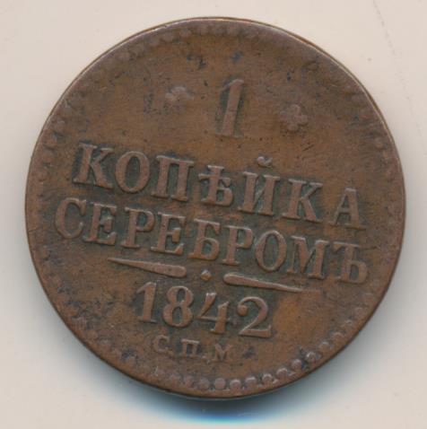 Лицевая сторона — вензель Николая I в бусовом ободке, оборотная — надпись «1 КОПЕЙКА СЕРЕБРОМ» и дата. Нормативный вес — 10,24 грамма, гурт гладкий.