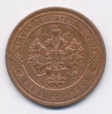 Лицевая сторона — двуглавый орел, надпись МЕДНАЯ РОССIЙСКАЯ МОНЕТА и обозначение номинала (одна копейка); оборотная — обозначение номинала (1 копейка) в бусовом ободке и дата. Нормативный вес — 3,28 грамма, гурт рубчатый.