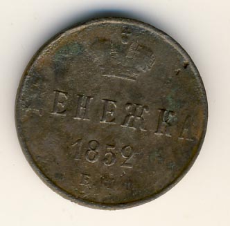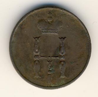 Лицевая сторона — вензель Николая I, оборотная — обозначение номинала (денежка) и дата. Нормативный вес — 2,56 грамма, гурт гладкий.