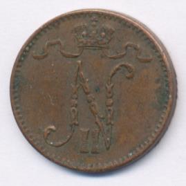 Лицевая сторона — вензель Александра II, оборотная — номинал (1 PENNIA) и дата. Нормативный вес — 1,28 грамма, гурт гладкий.