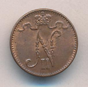 Лицевая сторона — вензель Александра II, оборотная — номинал (1 PENNIA) и дата. Нормативный вес — 1,28 грамма, гурт гладкий.