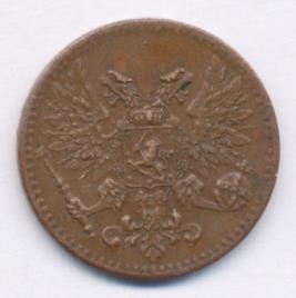 Лицевая сторона — вензель Александра II, оборотная — номинал (1 PENNIA) и дата. Нормативный вес — 1,28 грамма, гурт гладкий.