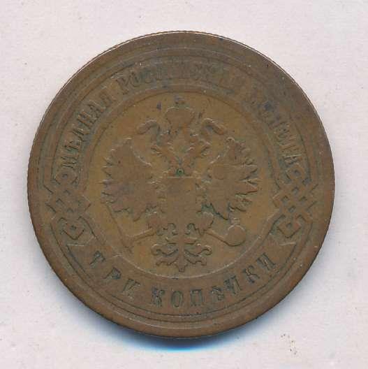 Лицевая сторона — двуглавый орел, надпись МЕДНАЯ РОССIЙСКАЯ МОНЕТА и обозначение номинала (три копейки); оборотная — обозначение номинала (3 копейки) в бусовом ободке и дата. Нормативный вес — 9,83 грамма, гурт рубчатый.