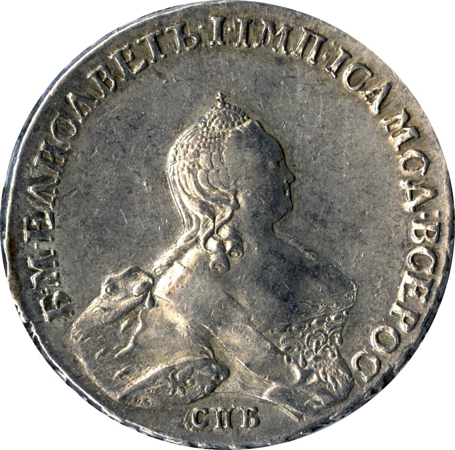 Гурт — надпись «с.петербурхскаго монетнаго двора». Знак Бенджамина Скотта BS в рукаве. Лицевая сторона — портрет императрицы и надпись «Б М Елисаветъ I IMP I САМОД ВСЕРОС», оборотная — двуглавый орел и надпись «монета рубль» и дата. Проба — 802, нормативный вес — 25,85 грамма.