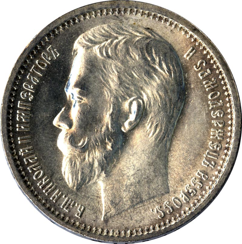 Николай II сохраняет принятый отцом тип, но на банковских монетах его портрет (работы Васютинского) повернут влево (на запад). На оборотной стороне сохраняется тот же герб, вплоть до знака АГ под задней ногой коня.