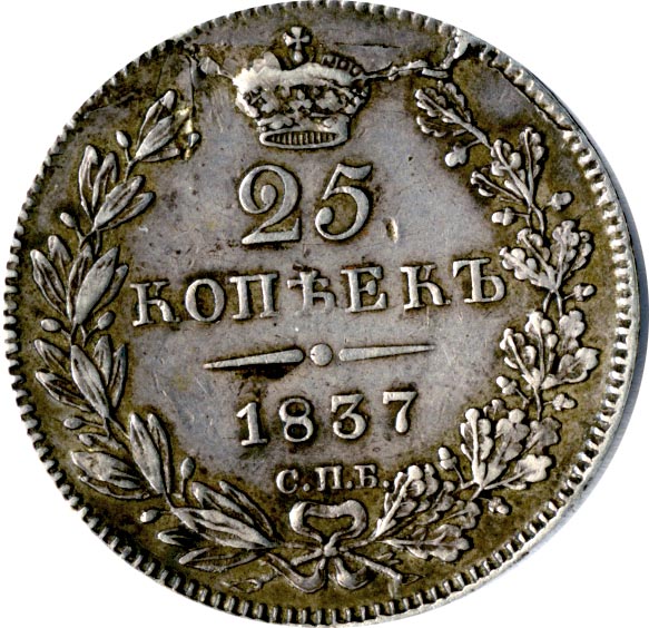 Лицевая сторона — новый гербовый орел с поднятыми крыльями и надпись «ЧИСТОГО СЕРЕБРА 1 ЗОЛОТНИКЪ 5 ДОЛЕЙ», оборотная —обозначение номинала (25 копеекъ), окруженное венком из лавровой и дубовой ветвей и дата.