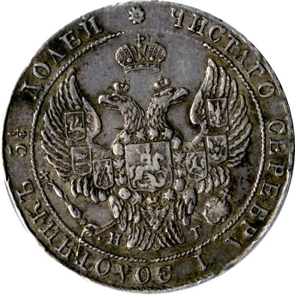 В январе 1830 года Николай I дает министру финансов Е. Ф. Канкрину устное указание «о сделании на золотых и серебряных монетах орла как на платиновых». На новом гербе крылья орла подняты, на них размещены шесть местных гербов — казанский, астраханский, сибирский, польский, херсонесский и финляндский. На груди орла — московский герб, на головах — короны. С 1832 года заодно с орлом изменяются и композиции обеих сторон монет: на лицевой стороне содержание чистого серебра в монете теперь обозначает круговая надпись. Нужно помнить, что доставшаяся Николаю в наследство от трех прежних правлений масса обесцененных бумажных денег является острой экономической проблемой. Правительство Николая удерживает объем ассигнаций строго на одном уровне, не прибегая к дополнительным эмиссиям; курс рубля ассигнациями колеблется вокруг 35 копеек.