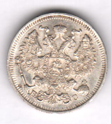 Лицевая сторона — гербовый орел, оборотная —обозначение номинала (20 копеекъ), окруженное венком из лавровой и дубовой ветвей и дата.