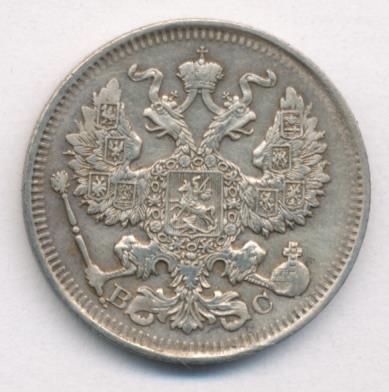 Лицевая сторона — гербовый орел, оборотная —обозначение номинала (20 копеекъ), окруженное венком из лавровой и дубовой ветвей и дата.