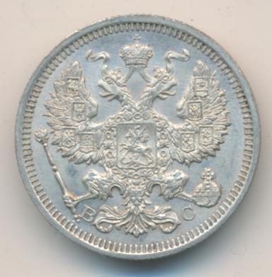 Лицевая сторона — гербовый орел, оборотная —обозначение номинала (20 копеекъ), окруженное венком из лавровой и дубовой ветвей и дата.