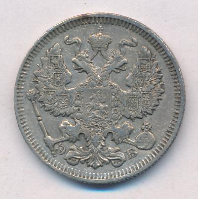 Лицевая сторона — гербовый орел, оборотная —обозначение номинала (20 копеекъ), окруженное венком из лавровой и дубовой ветвей и дата.