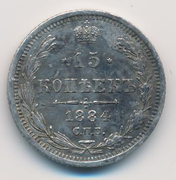 Лицевая сторона — гербовый орел, оборотная —обозначение номинала (15 копеекъ), окруженное венком из лавровой и дубовой ветвей и дата.