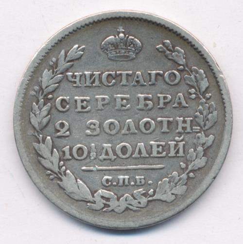 Лицевая сторона - двуглавый орел, дата и надпись «МОНЕТА РУБЛЬ», оборотная — окруженная венком из лавровой и дубовой ветвей надпись «ЧИСТАГО СЕРЕБРА 2 ЗОЛОТН 10 ДОЛЕЙ». Проба — 868, нормативный вес — 10,37 грамма.