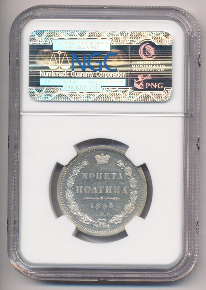 Лицевая сторона — новый гербовый орел с поднятыми крыльями и надпись «ЧИСТОГО СЕРЕБРА 2 ЗОЛОТНИКА 10 ДОЛЕЙ», оборотная — надпись «МОНЕТА ПОЛТИНА», окруженная венком из лавровой и дубовой ветвей и дата.