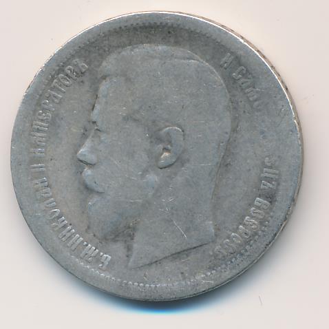 Лицевая сторона — портрет Николая II в круговой надписи «Б.М. НИКОЛАЙ II ИМПЕРАТОРЪ И САМОДЕРЖЕЦЪ ВСЕРОСС», оборотная — двуглавый орел, обозначение номинала (50 копеекъ) и дата.