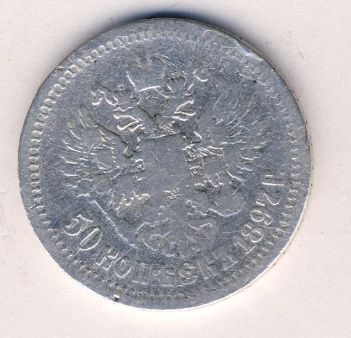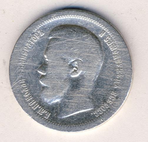 Лицевая сторона — портрет Николая II в круговой надписи «Б.М. НИКОЛАЙ II ИМПЕРАТОРЪ И САМОДЕРЖЕЦЪ ВСЕРОСС», оборотная — двуглавый орел, обозначение номинала (50 копеекъ) и дата.