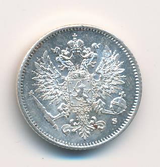 Лицевая сторона — российский двуглавый орел с гербом Великого княжества Финляндского на груди, оборотная — номинал и дата в венке из дубовых листьев. Проба — 750, нормативный вес — 1,27 грамма, гурт рубчатый.