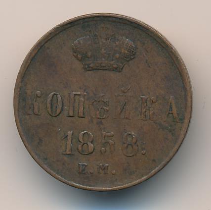Лицевая сторона — вензель Николая I, оборотная — обозначение номинала (копейка) и дата. Нормативный вес — 5,12 грамма, гурт гладкий.