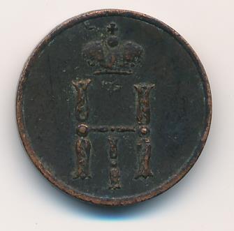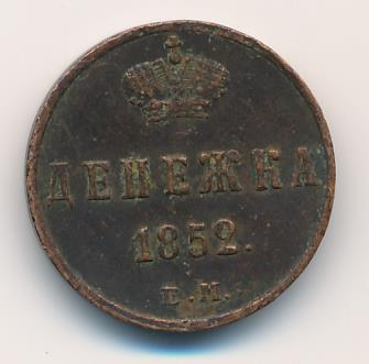 Лицевая сторона — вензель Николая I, оборотная — обозначение номинала (денежка) и дата. Нормативный вес — 2,56 грамма, гурт гладкий.