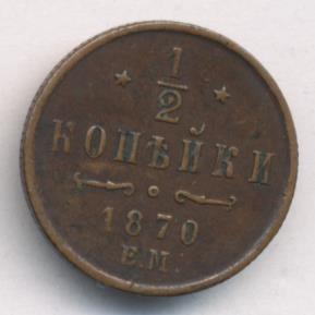 Лицевая сторона — вензель Александра II в венке из лавровой и дубовой ветвей; оборотная — обозначение номинала (1/2 копейки) и дата. Нормативный вес — 1,64 грамма, гурт рубчатый.