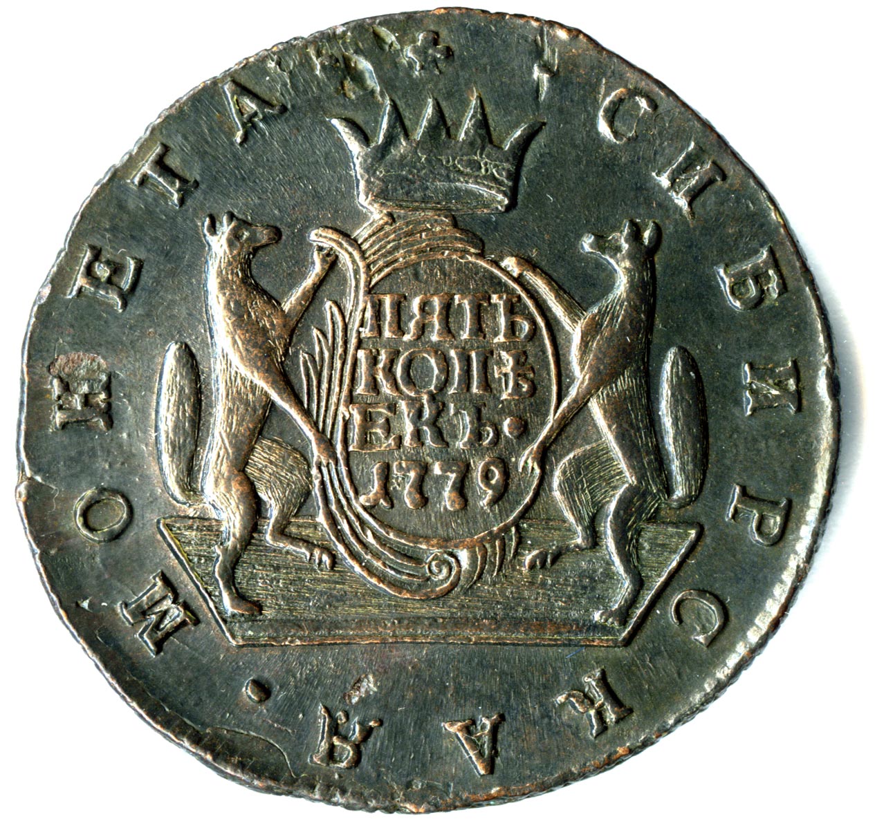 Лицевая сторона - два соболя поддерживают щит с обозначением номинала (пять копеекъ) под короной, надпись «СИБИРСКАЯ МОНЕТА». Оборотная — вензель Екатерины II в венке из пальмовой и лавровой ветвей. Гурт — надпись «колыванская медь» или шнур. Вес — 32,76 грамма.
