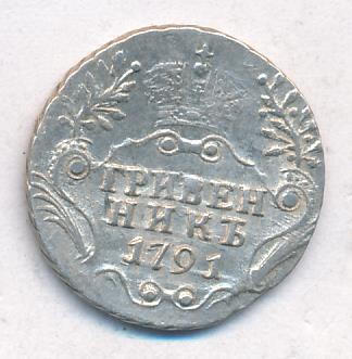 Медальер — Тимофей Иванов ( без знака или TI в рукаве). На оборотной стороне монеты — обозначение номинала в картуше под короной.