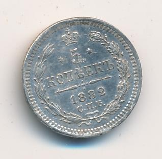 Лицевая сторона — гербовый орел, оборотная —обозначение номинала (5 копеекъ), окруженное венком из лавровой и дубовой ветвей и дата.
