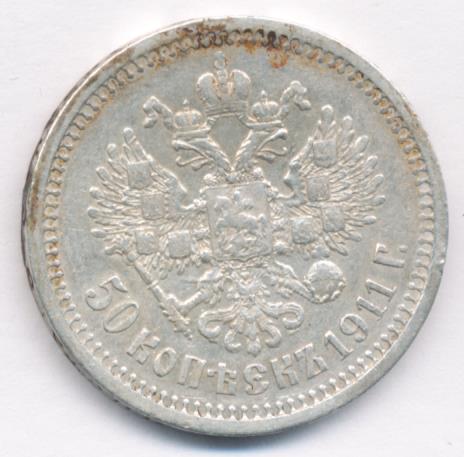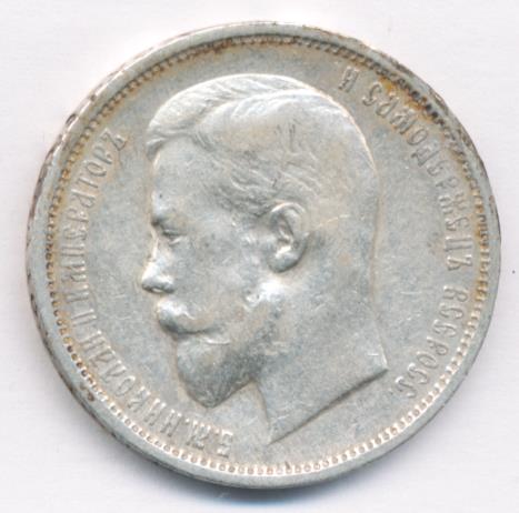 Лицевая сторона — портрет Николая II в круговой надписи «Б.М. НИКОЛАЙ II ИМПЕРАТОРЪ И САМОДЕРЖЕЦЪ ВСЕРОСС», оборотная — двуглавый орел, обозначение номинала (50 копеекъ) и дата.