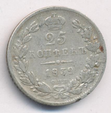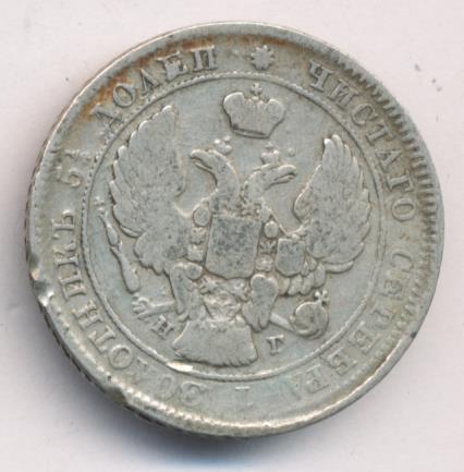 Лицевая сторона — новый гербовый орел с поднятыми крыльями и надпись «ЧИСТОГО СЕРЕБРА 1 ЗОЛОТНИКЪ 5 ДОЛЕЙ», оборотная —обозначение номинала (25 копеекъ), окруженное венком из лавровой и дубовой ветвей и дата.
