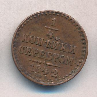 Лицевая сторона — вензель Николая I в бусовом ободке, оборотная — надпись «1/4 КОПЕЙКИ СЕРЕБРОМ» и дата. Нормативный вес — 2,56 грамма, гурт гладкий.