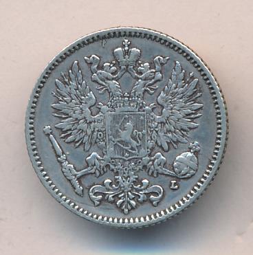 Лицевая сторона — российский двуглавый орел с гербом Великого княжества Финляндского на груди, оборотная — номинал и дата в венке из дубовых листьев. Проба — 750, нормативный вес — 2,55 грамма, гурт рубчатый.