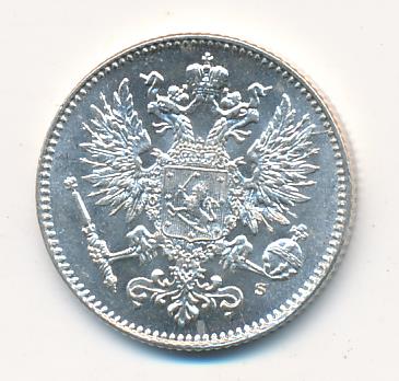 Лицевая сторона — российский двуглавый орел с гербом Великого княжества Финляндского на груди, оборотная — номинал и дата в венке из дубовых листьев. Проба — 750, нормативный вес — 2,55 грамма, гурт рубчатый.