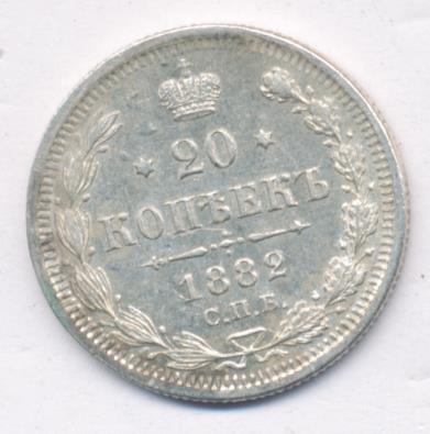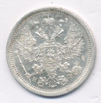 Лицевая сторона — гербовый орел, оборотная —обозначение номинала (20 копеекъ), окруженное венком из лавровой и дубовой ветвей и дата.
