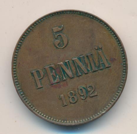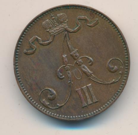 Лицевая сторона — вензель Александра II, оборотная — номинал (5 PENNIA) и дата. Нормативный вес — 6,40 грамма, гурт гладкий.