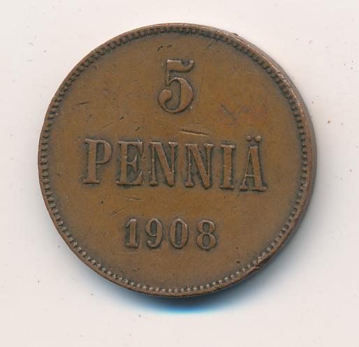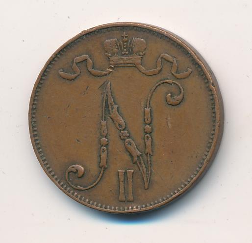 Лицевая сторона — вензель Александра II, оборотная — номинал (5 PENNIA) и дата. Нормативный вес — 6,40 грамма, гурт гладкий.