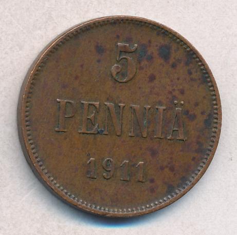 Лицевая сторона — вензель Александра II, оборотная — номинал (5 PENNIA) и дата. Нормативный вес — 6,40 грамма, гурт гладкий.