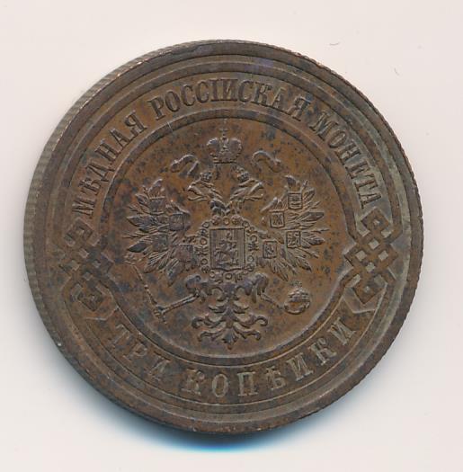 Лицевая сторона — двуглавый орел, надпись МЕДНАЯ РОССIЙСКАЯ МОНЕТА и обозначение номинала (три копейки); оборотная — обозначение номинала (3 копейки) в бусовом ободке и дата. Нормативный вес — 9,83 грамма, гурт рубчатый.