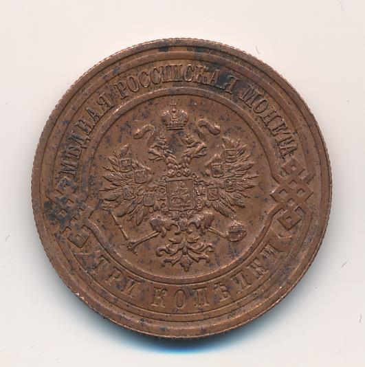 Лицевая сторона — двуглавый орел, надпись МЕДНАЯ РОССIЙСКАЯ МОНЕТА и обозначение номинала (три копейки); оборотная — обозначение номинала (3 копейки) в бусовом ободке и дата. Нормативный вес — 9,83 грамма, гурт рубчатый.