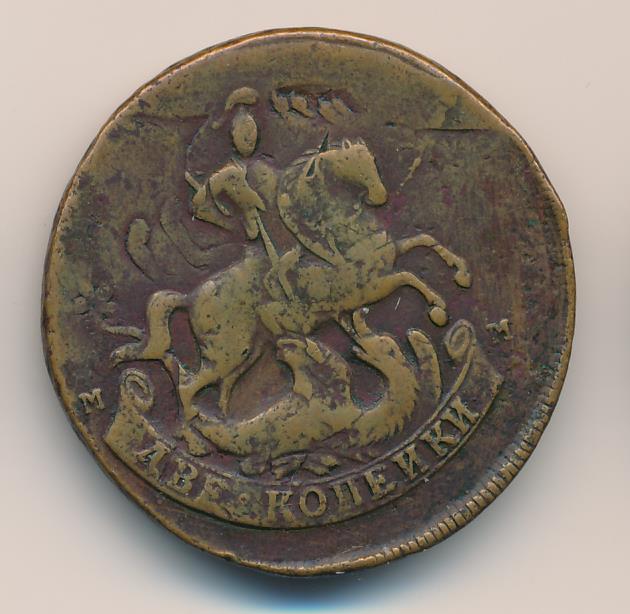 Лицевая сторона — Георгий Победоносец и обозначение номинала (две копейки) в картуше, оборотная — вензель Екатерины II и дата. Нормативный вес — 20,48 грамма, гурт — сетка или шнур.