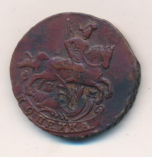 Лицевая сторона — Георгий Победоносец и обозначение номинала (копейка) в картуше, оборотная — вензель Екатерины II и дата. Нормативный вес — 10,24 грамма, гурт — сетка, или узор, или шнур.