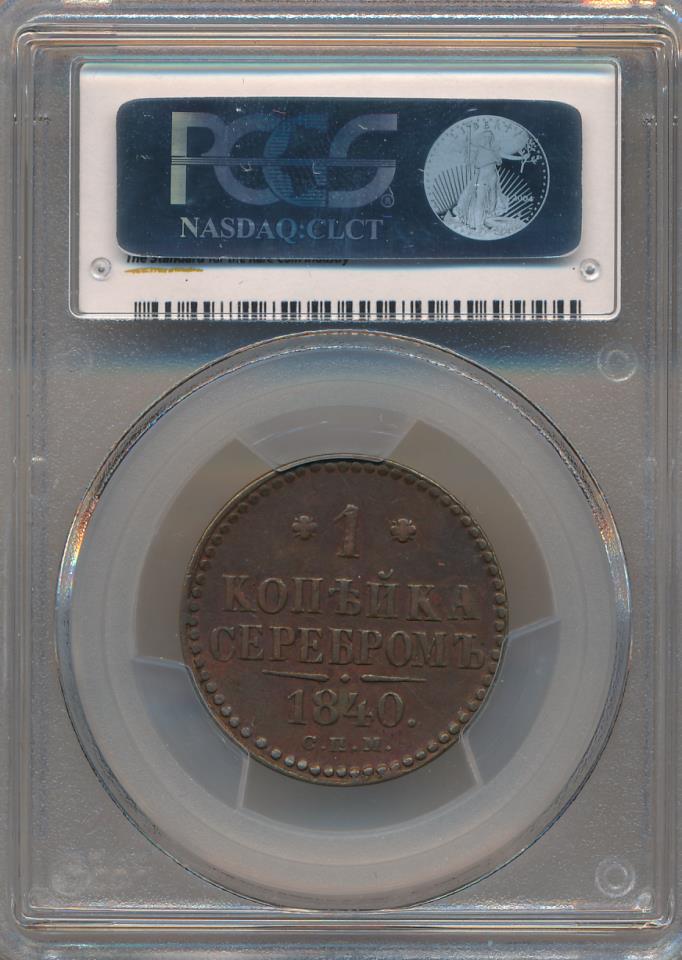 На новых монетах равенство серебряному курсу указано прямо в номинале: «1 КОПЕЙКА СЕРЕБРОМ». Указ об их выпуске следует 6 сентября 1840 года («О новой медной монете на серебро 16-рублевого в пуде достоинства»). Массовая чеканка началось за год до этого на Екатеринбургском (знак ЕМ) и Сузунском (знак СМ) дворах. В качестве временной меры в 1840-1843 годах к ним подключается Ижорский завод (знак СПМ). С 1844 года после «значительного скопления медной монеты в народном обращении» в Екатеринбурге производство прекращается, а в Сузуне сокращается.