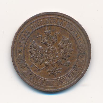 Лицевая сторона — двуглавый орел, надпись МЕДНАЯ РОССIЙСКАЯ МОНЕТА и обозначение номинала (одна копейка); оборотная — обозначение номинала (1 копейка) в бусовом ободке и дата. Нормативный вес — 3,28 грамма, гурт рубчатый.
